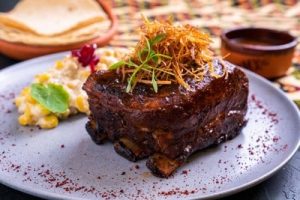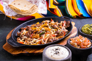 Con lomo y pollo, salteado de vegetales y tortillas....