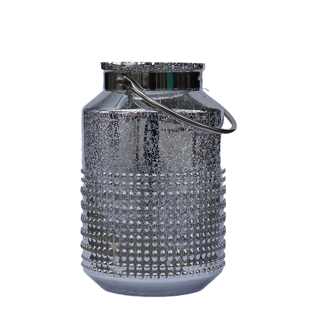 Cantina decorativa de vidrio con acabado plateado y textura en relieve que aporta brillo y sofisticación. Su diseño con asa metálica la hace práctica y elegante, ideal para ambientar cualquier espacio con un toque moderno y llamativo.